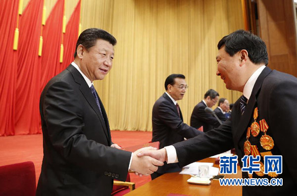 4月28日,2015年慶祝“五一”國際勞動節暨表彰全國勞動模范和先進工作者大會在北京人民大會堂隆重舉行。這是習近平等黨和國家領導人向全國勞動模范和先進工作者頒發榮譽證書。新華社記者鞠鵬攝
