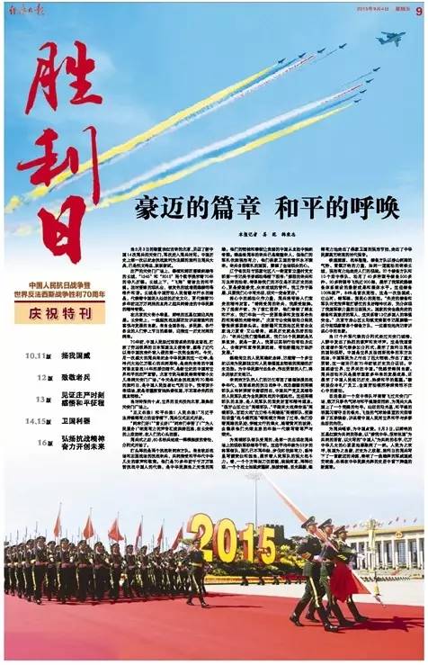 為閱兵喝彩,為中國點贊。9月3日,以鮮艷的五星紅旗為共同的形象,以“愛我中華、報效祖國”為共同的語言,以大寫的“中國人”為共同的名字,億萬中華兒女的心緊緊地凝聚到了一起。人民為之歡呼,祖國為之自豪,歷史為之欣慰,勝利日的閱兵寫下了一首豪邁的詩篇,奏響了一曲雄渾的軍威國威交響曲,必將在中華民族光輝的史冊中留下輝煌的新篇章。(作者:姜范 韓秉志)