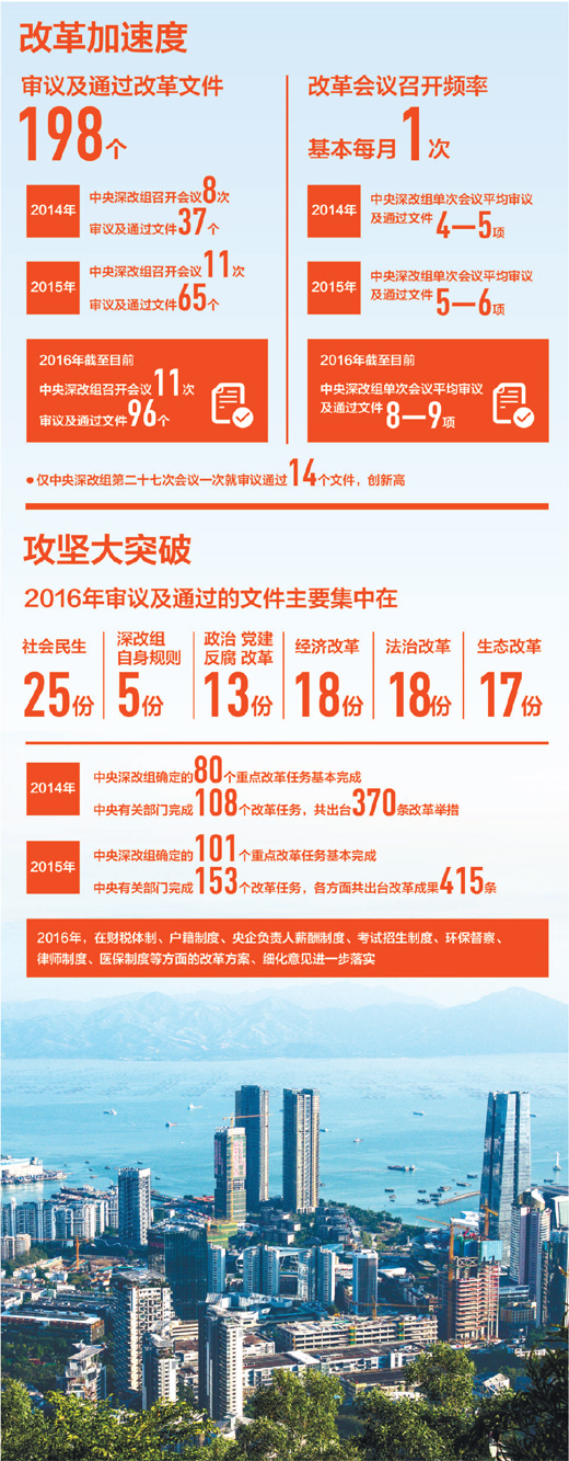 “如果把全面深化改革比作建造大廈的話(huà),這三年是夯基壘臺(tái)、選材備料、立柱架梁的三年,今年力爭(zhēng)把主體框架搭建起來(lái)。”2016年,全面深化改革的“四梁八柱”拔地而起。