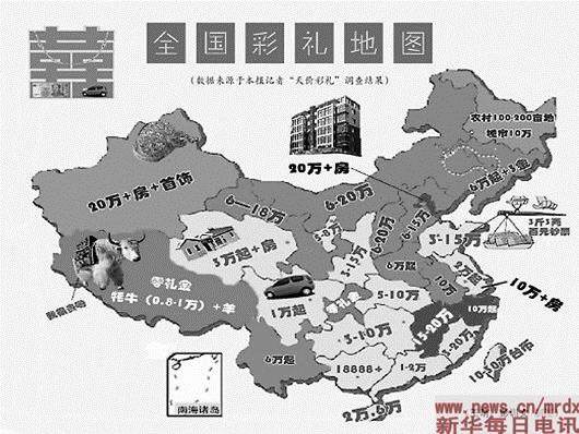媒體記者基于調(diào)查而繪制的新版《全國(guó)彩禮地圖》,直觀地反映出全國(guó)彩禮分布情況的顯著特征——“西部高東部低,山村高城郊低”。在河南、山東、貴州、陜西、甘肅等地,更表現(xiàn)出“越是貧困地區(qū),越出現(xiàn)高價(jià)彩禮”的特點(diǎn)。從某種程度上說,彩禮地圖的高低分布,基本上契合了當(dāng)?shù)亟?jīng)濟(jì)發(fā)展水平,即彩禮金額的多少與當(dāng)?shù)鼐用袢司芍涫杖氪笾鲁史幢取=Y(jié)婚要不要收彩禮,要收多少彩禮,也與當(dāng)?shù)啬信壤姆植记闆r相關(guān),男女比例相差越懸殊,男多女少的局面越嚴(yán)重,“天價(jià)彩禮”之風(fēng)越惡劣。反之,如果男女比例相差不大,分布均衡,則彩禮現(xiàn)象也鮮有容身之地。
