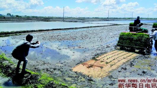 5月24日,黑龍江省五常市二河鄉農民使用新型地膜進行水稻插秧。闕文生在記錄五常大米插秧過程。記者高廣志攝