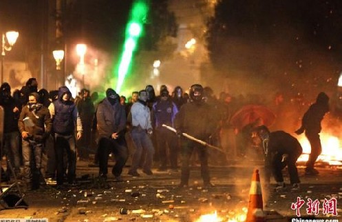 當地時間2月12日,希臘議會通過總額為33億歐元的新緊縮措施。希臘警察和示威者在首都雅典的街頭爆發了沖突。圖為示威者在雅典市中心向警察投擲石塊。