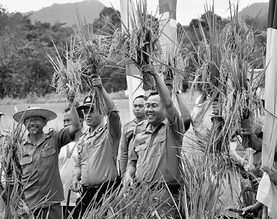 當地政府官員和村民高舉剛剛收割的水稻,興奮地贊不絕口。本報記者 張慧中攝