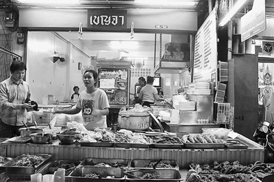 曼谷市區碧武里路7街并不寬敞的巷子里,布滿各式餐館。一家快餐店里顧客絡繹不絕,這里主營傳統泰餐:豬腳飯、炸魚段、炒青菜等,種類繁多,葷素均有。店主本佳告訴記者,一菜一飯需20—25泰銖(1泰銖約合0.2元人民幣),兩道菜再加5銖,只需25—30泰銖便可吃飽。本佳指著店門口懸掛的一個淺藍色牌子說,“我們就是Thong Fah”。Thong Fah在泰語里意為“藍旗”,即泰國政府推出的“藍旗”計劃,本佳的小店為顧客提供“藍旗餐”。