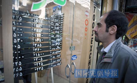 在美國嚴厲的制裁下,伊朗市場匯率頻繁暴跌。圖為2011年12月22日,在伊朗首都德黑蘭,一名男子查看匯率牌。新華社