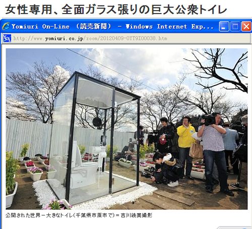 在市原市的小湊鐵道公司的飯給火車(chē)站前,有一塊用杉樹(shù)干密集圍成的、面積約200平方米的空地。如果沒(méi)人介紹,誰(shuí)也想象不出,這里面竟是一個(gè)女性專(zhuān)用廁所。如今,人們看到,空地中央安放了一個(gè)1.4平方米的單間式廁所,廁所的墻壁全部采用通亮的玻璃。坐在里面,可以看到遍布四周的五顏六色的盆栽鮮花。而且,從外面也能一覽廁所內(nèi)部如廁人的一舉一動(dòng)。玻璃廁所的設(shè)計(jì)者藤本壯介介紹稱(chēng),建造它是“希望使用者即使是在個(gè)人的方便空間也能欣賞到美麗的風(fēng)景”。