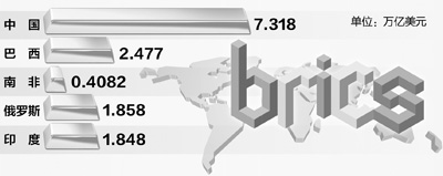 據統計,金磚國家總人口約占世界總人口的42%。2011年,國內生產總值合計約為13.9萬億美元,占世界總量的19.86%。圖為金磚國家2011年國內生產總值。 (數據來源:世界銀行 制圖:蔡華偉)