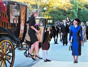 遞交國書儀式于當(dāng)?shù)貢r間下午3時10分,在皇宮廣場前的明治館舉行。卡羅琳乘坐仿古馬車前往皇宮,在沿途近萬人的夾道歡呼和注目之下,經(jīng)過二重橋進(jìn)入皇宮。