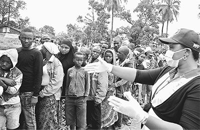 9月2日,在利比里亞首都蒙羅維亞以東60公里為控制埃博拉疫情而被隔離的小鎮多洛,一名世界糧食計劃署的工作人員正在協調當地居民排隊領取分發的糧食。 新華社發