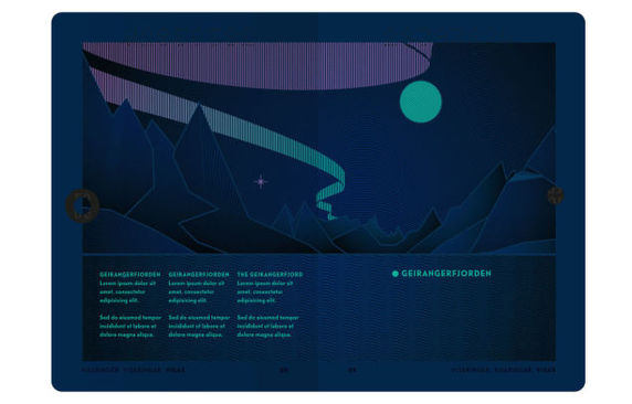 翻開后,我們會發(fā)現(xiàn),設(shè)計非常簡明干凈,主體是峽灣的形象。