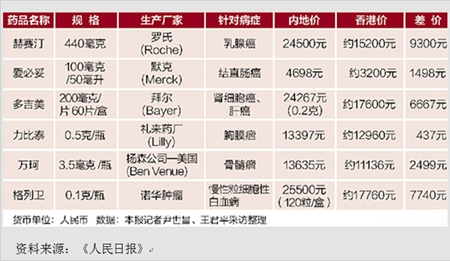 中國進(jìn)口藥價格高出其他國家同規(guī)格藥的現(xiàn)象十分常見,除了瑞士諾華公司的抗癌藥格列衛(wèi)在中國價格最高,《人民日報》此前報道中還提到羅氏制藥的治療乳腺癌赫賽汀和默克公司的治療結(jié)直腸癌的愛必妥,這兩款抗癌藥價格也都高于其他國家地區(qū)的零售價。