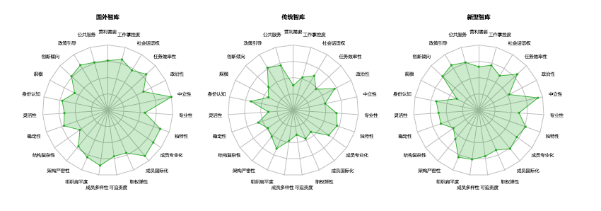 現(xiàn)代智庫(kù)20世紀(jì)40年代出現(xiàn),70年代后在國(guó)外形成行業(yè),90年代后被視為公共事務(wù)決策中的重要一環(huán)。同時(shí)期中國(guó)的資政機(jī)構(gòu)則經(jīng)歷了完全不同的發(fā)展軌跡。先是政府機(jī)關(guān)有專(zhuān)職的研究部門(mén),后來(lái)又組建了政府機(jī)關(guān)之外專(zhuān)司研究的機(jī)構(gòu),同時(shí)教育機(jī)構(gòu)也兼有研究職能。這三類(lèi)機(jī)構(gòu)在公共決策中都起到了重要作用且貢獻(xiàn)良多。但為什么學(xué)者和專(zhuān)家反而將國(guó)外智庫(kù)當(dāng)成標(biāo)桿?這個(gè)問(wèn)題頗為復(fù)雜,簡(jiǎn)單粗暴地講主要原因是:智庫(kù)這個(gè)行業(yè)突然受到普遍關(guān)注,專(zhuān)家學(xué)者們?cè)趯?duì)比扮演智庫(kù)角色的中國(guó)機(jī)構(gòu)與國(guó)外智庫(kù)時(shí)發(fā)現(xiàn),國(guó)外智庫(kù)具有一些中國(guó)的類(lèi)似機(jī)構(gòu)所不具有的優(yōu)勢(shì)。特別是國(guó)外智庫(kù)中的佼佼者的表現(xiàn)令人嘆為觀止。事實(shí)上,很多學(xué)者專(zhuān)家口中的國(guó)外智庫(kù)指的只是諸如蘭德公司、卡耐基國(guó)際和平基金會(huì)、布魯斯金學(xué)會(huì)這樣的業(yè)中翹楚。我們有一個(gè)研究針對(duì)智庫(kù)的組織內(nèi)涵。研究方法是先從文獻(xiàn)中找出多種組織特征,這些特征會(huì)偏向咨詢(xún)研究類(lèi)機(jī)構(gòu),但這個(gè)條件不是必須的,只要是組織的特征即可。我們共找出23個(gè)組織特征,并讓專(zhuān)家分別給他心目中的國(guó)外智庫(kù)、中國(guó)傳統(tǒng)智庫(kù)和中國(guó)新型智庫(kù)打分,評(píng)分結(jié)果如下圖所示。從組織特征輪廓上來(lái)看,中國(guó)新型智庫(kù)與國(guó)外智庫(kù)非常接近,與中國(guó)傳統(tǒng)智庫(kù)差別很大,而且中國(guó)新型智庫(kù)在所有組織特征上的得分都要高于中國(guó)傳統(tǒng)智庫(kù)。