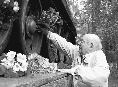 二戰老兵韋爾納向德俄博物館的蘇聯紅軍坦克獻花。