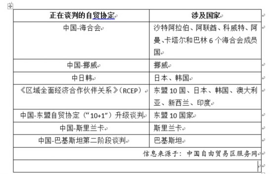 “中國對外商談自由貿易協定總體情況”還顯示,我國正在談判的自貿協定7個,涉及22個國家,分別是中國與海灣合作委員會(GCC)、澳大利亞、斯里蘭卡和挪威的自貿協定,以及中日韓自貿協定、《區域全面經濟合作伙伴關系》(RCEP)協定和中國-東盟自貿協定(“10+1”)升級談判、中國-巴基斯坦自貿協定第二階段談判。