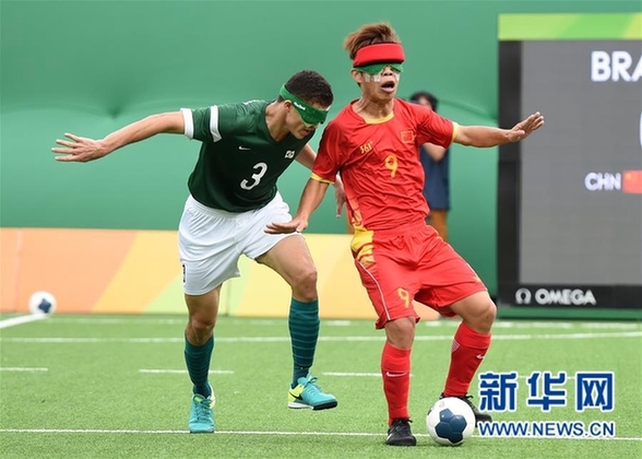 中國(guó)隊(duì)球員王周彬(右)在比賽中拼搶。在里約殘奧會(huì)男子盲人足球半決賽中,中國(guó)隊(duì)以1比2負(fù)于巴西隊(duì),無(wú)緣決賽。新華社記者李鋼攝