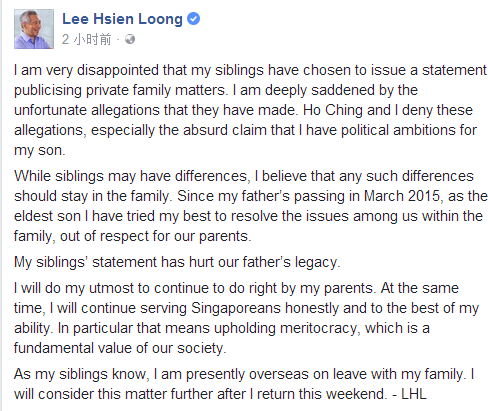 針對兩人的指控,李顯龍全然否認。他說:“兄弟姐妹之間可能存在分歧,我認為這些分歧應該是只限在家庭里。自從我父親在 2015 年3月去世,出于對父母的尊重,身為長子,我盡一切努力處理我們家人之間的紛爭。我弟弟妹妹的公開信傷害了父親的名譽。我會繼續盡我全力無愧于父母,與此同時,也會繼續竭盡所能忠誠地為新加坡服務,特別是堅持唯才是用,而這是我們社會的基本價值觀。我的弟弟妹妹們都知道我和家人在國外度假,這個周末回國后我會考慮后續的處理。”