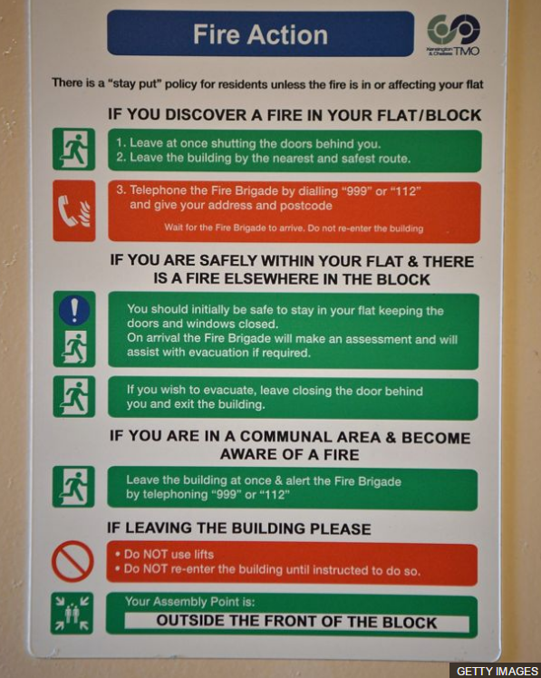 據英國廣播公司(BBC)報道,住戶們確實收到過公寓管理方發布的有關火災來時“原地不動”的指導原則,建議他們遇火災時應留在屋里,除非自己的公寓內部或公寓外部的走廊起火。