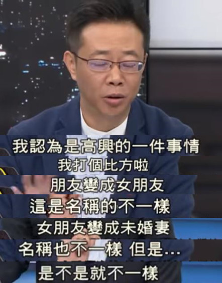 臺(tái)灣政論節(jié)目《少康戰(zhàn)情室》中,民進(jìn)黨“立委”張宏陸就此事欣喜表示,這次改名字是個(gè)高興事兒。為了論證自己的結(jié)論,張進(jìn)行了這樣一番闡述:你看,朋友變女朋友,名稱(chēng)不一樣!女朋友變未婚妻,名稱(chēng)也不一樣!是不是親密度就不一樣了!