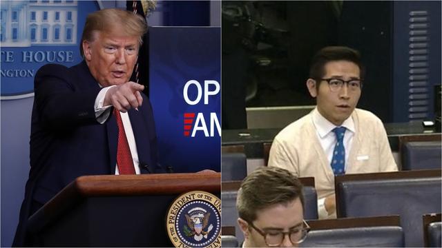 臺籍上海東方衛視駐白宮記者張經義早前在美國總統特朗普的記者會上提問。(圖片來源網絡)