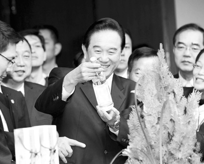 2月26日,陳云林參觀云林縣特產時,對名為“福祿壽”的白酒產生興趣。(中新社發)