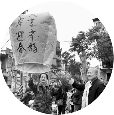 近日,臺灣毫芒雕刻家陳逢顯(右)與傳統天燈工藝大師林國和(左)一起放飛寫有“兩岸迎春· 共享幸!钡奶鞜簟P卤笔衅较獏^放天燈久負盛名,已有百余年歷史。 王東明攝