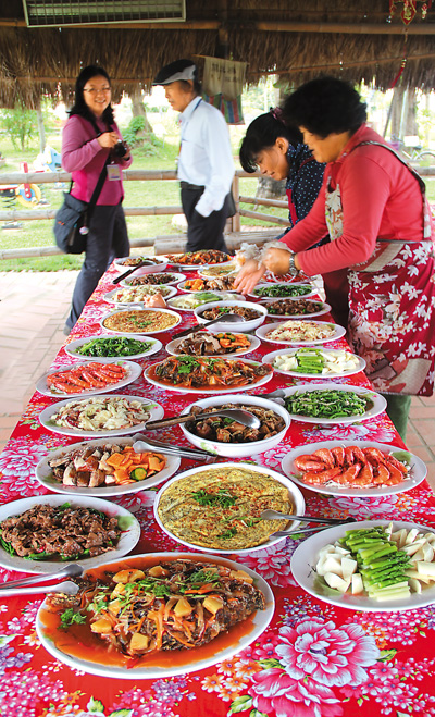 農忙時節農家在地頭吃的“割稻飯”,用的都是當地當季作物,近幾年大受城市游客歡迎。圖為臺南后壁鄉田間為迎接游客準備的“割稻飯”。