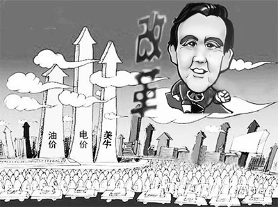 面對飛漲的物價和各界的壓力,堅持改革的馬英九會成為總能化險為夷的政治超人嗎?《人民日報海外版》“臺港澳”版合成圖片