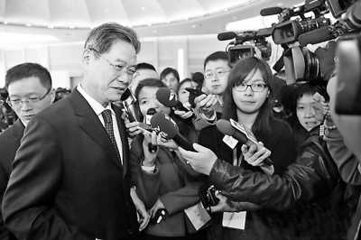 論壇上,國臺辦主任張志軍被兩岸記者包圍。中新社發