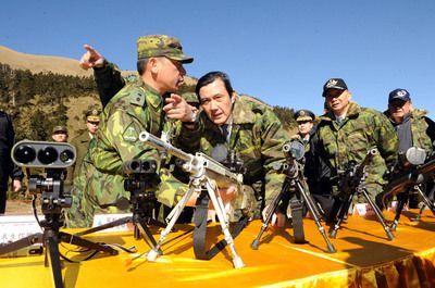 人民網(wǎng)報(bào)道:馬英九14日前往合歡山武嶺視察臺(tái)灣陸軍特訓(xùn)中心武嶺寒訓(xùn)基地,慰問受訓(xùn)士兵并參觀特訓(xùn)中心各式雪地狙擊所使用的特殊裝備。