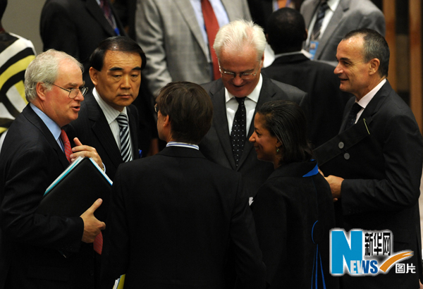 6月9日,在紐約聯合國總部安理會會議廳,英國常駐聯合國代表馬克·格蘭特、中國常駐聯合國代表李保東、德國常駐聯合國代表彼得·魏提格、俄羅斯常駐聯合國代表丘爾金、美國常駐聯合國代表蘇珊·賴斯、法國常駐聯合國代表阿羅德(從左至右)在交談。新華社記者申宏攝