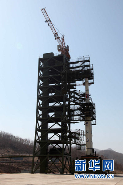 這是4月8日在朝鮮平安北道鐵山郡東昌里的“西海衛星發射場”拍攝的已經基本安裝完成的“銀河3號”運載火箭。新華社記者張利攝