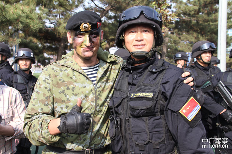 2012年4月23日下午,在俄方參演軍艦停靠的碼頭上,參加“海上聯合-2012”中俄海上聯合軍事演習的中俄雙方海軍特戰隊員進行表演交流。圖為帶隊表演的中俄雙方特戰隊軍官。攝影:穆亮龍