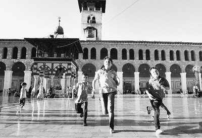 敘利亞兒童在大馬士革的倭瑪亞清真寺前玩耍。焦翔攝