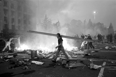 圖為5月2日,在烏克蘭南部城市敖德薩,工會(huì)大樓附近的一個(gè)臨時(shí)帳篷被燒毀。烏克蘭南部黑海沿岸城市敖德薩2日發(fā)生親政府與反政府兩派民眾沖突,導(dǎo)致43人死亡。新華社發(fā)