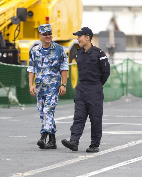 7月5日,參觀日本伊勢號直升機航母的中國海軍官兵與日本海上自衛隊隊員交流。