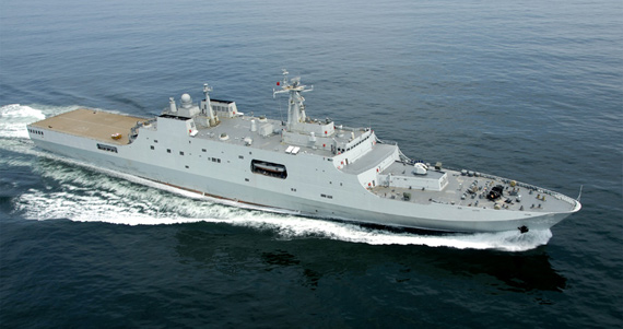 071型兩棲船塢登陸艦有幾大特點(diǎn):一是噸位大,抗風(fēng)浪性能好;二是后甲板較大,并且有機(jī)庫(kù),可以容納至少四架直-8直升機(jī);三是其船塢可以搭載大量的兩棲作戰(zhàn)裝備,比如氣墊船、兩棲坦克、兩棲運(yùn)兵車(chē)等,若需要登島作戰(zhàn)或登陸作戰(zhàn)時(shí),還可以搭載大量兵力以及主戰(zhàn)坦克等重型設(shè)備,并進(jìn)行遠(yuǎn)程兵力投送。