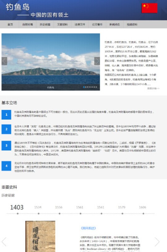 釣魚島專題網(wǎng)站主要包括:基本立場、自然環(huán)境、歷史依據(jù)、文獻資料、法律文件、視頻資料、新聞動態(tài)和論文著作等板塊,發(fā)布了一系列歷史文獻和法律文件,有力地證明釣魚島及其附屬島嶼都是中國的固有領(lǐng)土,中國對其擁有無可爭辯的主權(quán)。網(wǎng)站先行開通了中文版,隨后還將開通英、日、法、德、西、俄、阿等其他文字版本。