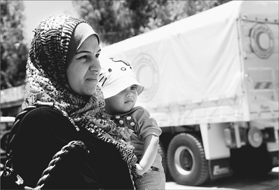 位于敘利亞首都大馬士革西南的達拉亞市6月1日收到了自2012年以來的首批人道主義援助物資。圖為當天在大馬士革西郊的穆阿達米亞鎮(zhèn),一名婦女和她的孩子等待領(lǐng)取人道主義援助物資。新華社發(fā)