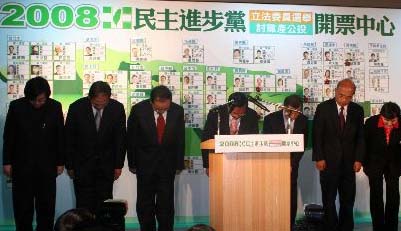 1月12日,民進黨在第七屆臺灣“立委”選舉中大敗。圖為當(dāng)晚除呂秀蓮?fù)獾钠渌襁M黨黨魁,在民進黨中央黨部向選民鞠躬道歉。