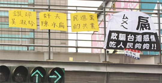 臺(tái)中市文心路及大雅路口的天橋上,日前出現(xiàn)“銀婦吳淑珍、奸夫陳水扁”、“欺騙臺(tái)灣感情,吃人民夠夠”海報(bào)及布條,讓人側(cè)目。(臺(tái)灣《聯(lián)合報(bào)》圖)