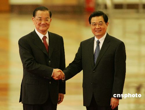 2007年4月28日,中共中央總書記、國家主席胡錦濤在北京人民大會堂會見中國國民黨榮譽主席連戰等出席第三屆兩岸經貿文化論壇的嘉賓,并同全體與會代表一起合影。(中新社)