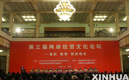 2007年4月28日,第三屆兩岸經貿文化論壇在北京人民大會堂開幕。(新華社)