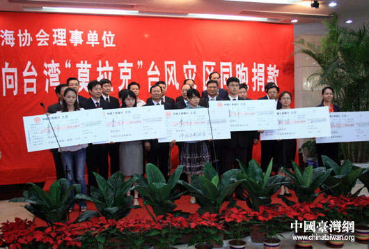 8月12日下午,海協(xié)會(huì)18家理事單位舉行“向臺(tái)灣‘莫拉克’臺(tái)風(fēng)災(zāi)區(qū)同胞捐款儀式”,18家理事單位共向受災(zāi)臺(tái)胞捐款計(jì)1億1100萬元人民幣。(中國臺(tái)灣網(wǎng) 鐘寶華 攝)