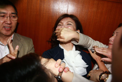 臺灣立法機構21日審查關于開放大陸學生來臺就學的“陸生三法”。教育主管部門及大學校長紛紛表示支持,民進黨民代則激烈反對。圖為綠營民代捂住國民黨民代趙麗云(中)的嘴阻撓會議進行。