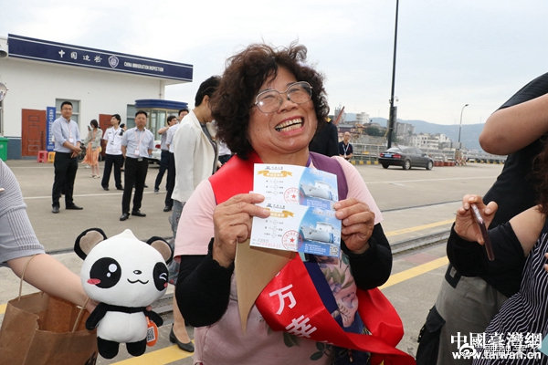 玉環市大麥嶼港對臺海上直航第20萬人次幸運旅客劉細妹獲贈“中遠之星”往返船票一套。
