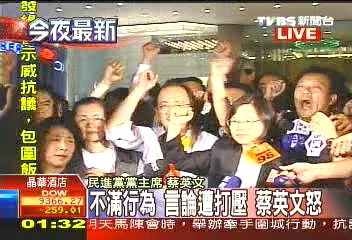 蔡英文在晶華酒店外率眾抗議(2008年11月5日晚的臺灣電視畫面)