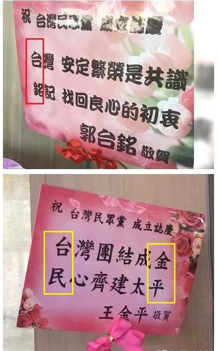 黨名引發的第二個關注點,是“臺灣民眾黨”一度被輿論叫成了“臺民黨”,諧音“臺銘黨”,這在選舉敏感期的當下,不能不引發一些看上去有些無厘頭的聯想。參加國民黨初選失利的郭臺銘,近期一直被傳將離開國民黨與柯文哲合作參與2020年選舉,難道取名“臺銘黨”是在向郭董示好?當然,這種猜想漏洞太多,畢竟還有一位也與柯文哲關系“曖昧”的國民黨大佬,就是王金平。這不,臺灣民眾黨創黨大會的當天,郭臺銘和王金平都送了花,而且兩人的花籃就擺在大門左右兩側最醒目的位置,郭臺銘的花語是以“臺銘”藏頭,王金平的花語以“臺民”藏頭、以“金平”藏尾,這樣如果都不能引發外界聯想的話,也太不現實了。