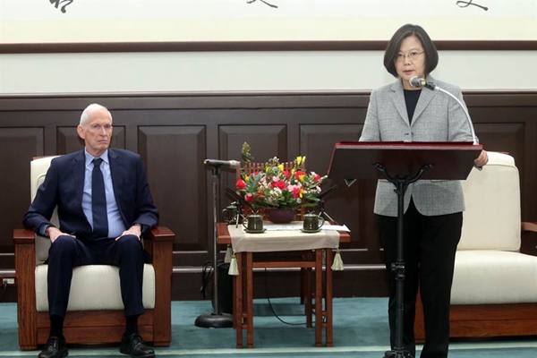 蔡英文(右)會(huì)見(jiàn)“美國(guó)在臺(tái)協(xié)會(huì)”主席莫健(左)。(圖片來(lái)源:臺(tái)灣“中時(shí)電子報(bào)”)