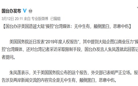 美國國務院近日發表“2019年度人權報告”,竟然提到“大陸企圖以商業壓力‘操控’臺灣媒體,還對臺灣記者采訪采取限制手段”等無中生有的事情,國臺辦發言人朱鳳蓮12日回應時做了以上表示。