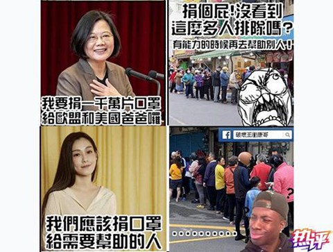 那么,現在臺灣島內口罩短缺的問題解決了嗎?當蔡英文宣布向疫情嚴重的國家捐贈1000萬個口罩,包括,除向美國每周捐贈的10萬個之外再追加的200萬個,向歐盟國家捐贈的700萬個,以及捐給“友邦”的100萬個。此外,還有“新南向”國家也有份……對此,島內網友拋出了下面這張圖表明態度: